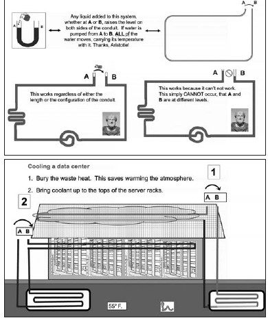John’s invention for cooling data centers goes back millennia, using a common-sense principle that Aristotle articulated, “Water seeks its own level.” By constructing a loop of pipe partially buried ten feet below ground, and using a small pump, water is circulated through the pipe and transfers heated water from the data center to where the temperature is 55 degrees and brings the resulting colder water to the location of the server, which cools the building.