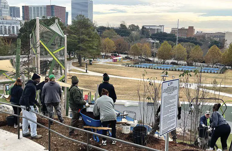 On December 4, volunteers from Columbia Green and TD Bank gathered at Finlay Park to assist City of Columbia park rangers planting native trees, shrubs, and grasses to celebrate TD Tree Days one day before South Carolina’s Arbor Day.