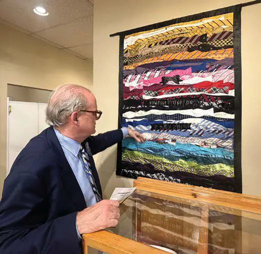Lancaster shows a wall hanging which included the bow ties from the 2014 event that landed Brittons in the Guinness Book of World Records.