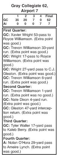 The War Eagles went back to the air on their third drive, which began at the Airport 34. Wright connected with Trevon Williamson for 17 yards. Then he threw a quick pass to Royce Williamson, who broke a couple Airport tackles on his way to the end zone. Mims knocked through his third extra point as Gray went ahead 21-0 with 6:48 left in the first quarter.